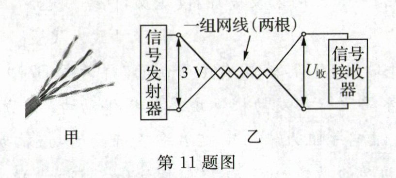 11. (2025·江苏盐城期中)如图甲是家用网线“双绞线”的内部结构图.每组网线由两根导线缠绕而成,生活中常用它来传输弱电信号.按如图乙所示电路,使用其中一组网线连接信号发射器和信号接收器,能实现信号的传输.传输信号时,发射器产生3 V的稳定电压.为了避免各种干扰,传输电流不得小于5 mA.如果信号接收器两端的电压U接收≥2 V,信号就能被成功识别.在传输信号过程中,为了保证信号能被成功识别,传输信号的网线电阻最大为______Ω.若连接发射器和接收器的这组网线电阻为100 Ω,则为了避免信号干扰且能被成功识别,信号接收器的最小电阻值为______Ω,最大电阻值为______Ω.