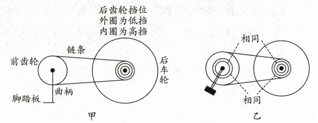 前齿轮、曲柄和脚踏板构成一个杠杆结构,动力是人给脚踏板的蹬力,阻力是链条对前齿轮的拉力,动力臂是曲柄的长度(前齿轮的轴心到脚踏板的距离),阻力臂是前齿轮半径.前齿轮、后齿轮和后车轮构成另一个杠杆结构,动力是链条对后齿轮的拉力,阻力是地面给后车轮的阻力,动力臂是后齿轮半径,阻力臂是后车轮半径.