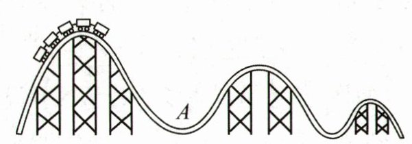 过山车在开始旅行时,是靠一个机械装置推上最高点的,但在第一次下行起,就再没有任何装置为它提供动力了.从这时起,带动它沿轨道行驶的唯一"发动机"就是重力势能,过山车的重力势能在处于最高点时达到最大值,当它开始下行时,重力势能不断减小,动能不断增大,由于摩擦,损耗了少量的机械能,所以随后的"小山丘"设计的比开始时的"小山丘"低(如图所示).像所有列车一样,过山车也安装了机械制动装置,使它在结束行程或在紧急情况下能够准确地停下来.