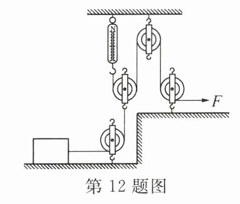 12.B 解析:由图可知,动滑轮上绳子的段数 $n = 2$,则绳子自由端移动的距离 $s = nh = 2× 1\ m=2\ m$,不计绳重和滑轮组内的摩擦,拉力F的大小等于弹簧测力计的示数200N,10s内拉力做的总功 $W_{总} = Fs = 200\ N× 2\ m=400\ J$,则拉力做功的功率 $P=\frac{W_{总}}{t}=\frac{400\ J}{10\ s}=40\ W$,故C错误;物体的重力 $G = mg = 300\ kg× 10\ N/kg=3000\ N$,则物体所受的摩擦力 $f=\frac{1}{10}G=\frac{1}{10}× 3000\ N=300\ N$,因为物体在水平方向上做匀速直线运动,所以拉力F做的有用功为克服物体所受摩擦力所做的功,即 $W_{有用} = fh = 300\ N× 1\ m=300\ J$,则滑轮组的机械效率 $\eta=\frac{W_{有用}}{W_{总}}× 100\%=\frac{300\ J}{400\ J}× 100\%=75\%$,故A错误;不计绳重和滑轮组内的摩擦,拉力 $F=\frac{1}{n}(f + G_{动})$,则动滑轮的重力 $G_{动} = nF - f = 2× 200\ N-300\ N=100\ N$,故B正确;不计绳重和滑轮组内的摩擦,滑轮组的机械效率 $\eta=\frac{W_{有用}}{W_{总}}× 100\%=\frac{fh}{fh + G_{动}h}× 100\%=\frac{f}{f + G_{动}}× 100\%=\frac{1}{1+\frac{G_{动}}{f}}× 100\%$,增大物重,物体对水平面的压力增大,水平面的粗糙程度不变,则物体所受摩擦力增大,滑轮组的机械效率增大,故D错误。