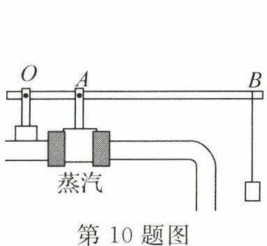10.B 解析:阀门恰好被顶开时,蒸汽对阀门向上的力 $F_{1}=pS=6× 10^{5}\ Pa× 2× 10^{-4}\ m^{2}=120\ N$,大气对阀门向下的压力 $F_{2}=p_{0}S=1× 10^{5}\ Pa× 2× 10^{-4}\ m^{2}=20\ N$,则阀门对杠杆A点的支持力 $F=F_{1}-F_{2}=120\ N-20\ N=100\ N$,由杠杆平衡条件可得 $F× OA=G× OB$,所以B处所挂重物的重力 $G=\frac{F× OA}{OB}=\frac{100\ N× 0.5\ m}{2\ m}=25\ N$,故B正确。