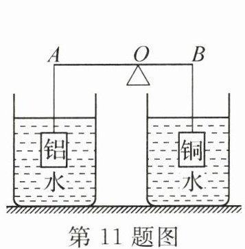 11.B 解析:由题意可知,轻质杠杆AOB的左右两端分别吊着一实心铝块和铜块,此时杠杆在水平位置平衡,由杠杆的平衡条件可得 $G_{铝}× OA=G_{铜}× OB$,由 $G=mg=\rho Vg$ 可得,$\rho_{铝}V_{铝}g× OA=\rho_{铜}V_{铜}g× OB$,$\rho_{铝}<\rho_{铜}$,所以 $V_{铝}× OA>V_{铜}× OB$。将铝块和铜块同时浸没在水中,由阿基米德原理可得 $F_{浮}=\rho_{水}V_{排}g=\rho_{水}V_{物}g$,则此时作用在杠杆左、右两端的拉力分别为 $F_{A}=\rho_{铝}V_{铝}g-\rho_{水}V_{铝}g$、$F_{B}=\rho_{铜}V_{铜}g-\rho_{水}V_{铜}g$,则 $F_{A}× OA - F_{B}× OB=(\rho_{铝}V_{铝}g-\rho_{水}V_{铝}g)× OA-(\rho_{铜}V_{铜}g-\rho_{水}V_{铜}g)× OB=\rho_{水}V_{铜}g× OB-\rho_{水}V_{铝}g× OA=\rho_{水}(V_{铜}× OB - V_{铝}× OA)g<0$,即 $F_{A}× OA<F_{B}× OB$,所以B端下降,故B正确。