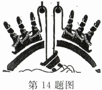 14.亮点原创 如图是汉代画像砖上描绘的《史记》中“泗水取鼎”画面,两边各有数人用绳子通过滑轮拉起掉落水中的鼎.图中的滑轮是______(选填“定”或“动”)滑轮,这种滑轮______(选填“能”或“不能”)起到省力的作用;如果此时每个人对绳子的拉力均为F,鼎受到的浮力为$F_{1}$,则鼎的重力为______.