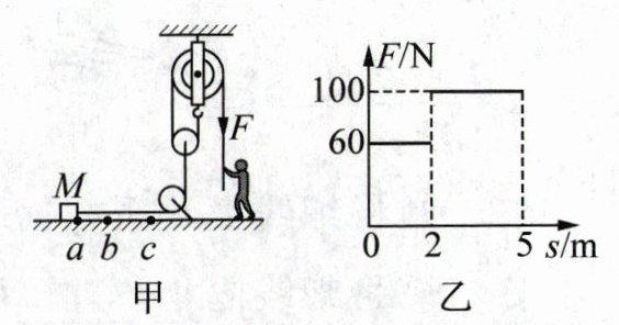 12. 如图甲所示装置,小欢用力F向下拉绳子,使物体M在水平地面匀速移动,地面bc段比ab段更粗糙.物体M重为400 N,动滑轮重为5 N.ab= 2 m,bc= 3 m.物体M从a点到c点过程中,拉力F与M移动距离的关系图像如图乙.不考虑物体大小对运动的影响,忽略绳重及滑轮转轴处的摩擦,关于该过程,下列说法正确的是( )
