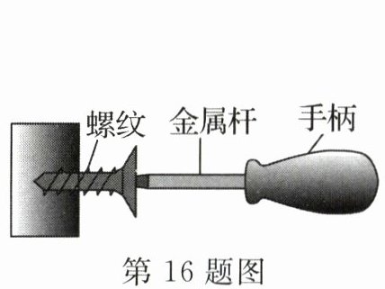 16.(2025·江苏徐州月考)如图所示是用螺丝刀拧螺丝的情景.手柄______(选填“粗”或“细”)一些的螺丝刀用起来更省力;用力转动螺丝刀的过程中,如果人始终垂直于手柄用力,且力F作用在手柄最粗位置,手柄最粗位置直径为R,则每旋转1圈手对螺丝刀做功$W= $______(用字母表示),螺丝钉上螺纹______(选填“密”或“疏”)一些的螺丝钉拧起来更省力.