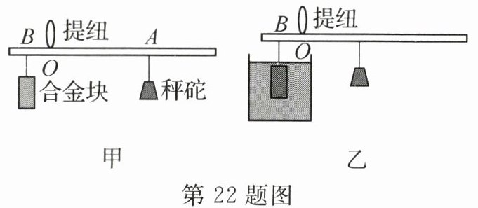 22.如图甲是一个密度秤,提纽位于O处,装秤钩的B处挂着一个体积为$50cm^{3}$、密度为$6g/cm^{3}$的均匀合金块,则合金块的质量为______g.质量为100g的秤砣放在A处时,秤杆恰好水平平衡,将合金块浸没在水中,秤砣应向______(选填“左”或“右”)移动才能再次使密度秤水平平衡.现将合金块浸没于某种液体中(如图乙),秤砣移到C位置(未画出)时密度秤水平平衡,测得$OB= 20cm$、$OC= 48cm$,则该种液体的密度为______$kg/m^{3}$.(g取10N/kg)