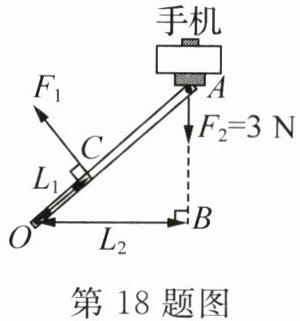 18.如图是使用手机和自拍杆自拍的示意图,已知自拍杆长度为1m(质量不计),手机对自拍杆竖直向下的作用力$F_{2}= 3N$,若$L_{1}= 10cm$、$L_{2}= 80cm$,则手垂直于杆的动力$F_{1}= $______N;因拍摄需要伸长自拍杆时,若保持$F_{1}$的作用点、方向及支点不变,则$F_{1}$的大小将______.