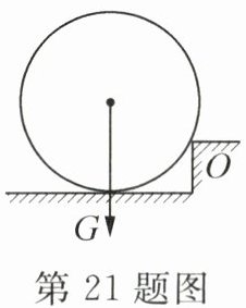 21.200 100 解析:如右图所示,作出最长动力臂L、最小力F的示意图,并作出阻力臂 $L'$,可知 $L = 2r = 2× 0.5\ m=1\ m$,阻力臂 $L'$ 即为OB的长度,$h = 20\ cm=0.2\ m$,则 $AB = r - h = 0.5\ m-0.2\ m=0.3\ m$,$\triangle OAB$ 为直角三角形,由勾股定理可得 $L' = OB=\sqrt{OA^{2}-AB^{2}}=\sqrt{(0.5\ m)^{2}-(0.3\ m)^{2}}=0.4\ m$。由杠杆的平衡条件可得 $FL = GL'$,则最小力 $F=\frac{GL'}{L}=\frac{500\ N× 0.4\ m}{1\ m}=200\ N$。将这个轮子滚上台阶至少需要做的功等于克服轮子重力做的功,即 $W = Gh = 500\ N× 0.2\ m=100\ J$。