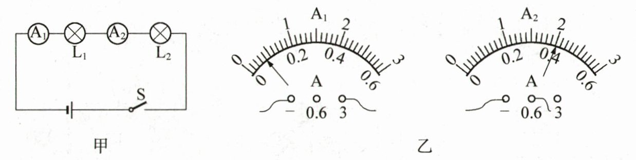 (2) 第一小组的同学实验时电流表$A_1$指针偏转角度比$A_2$小,如图乙所示,据此他们判断"串联电路中各处的电流不等".请你指出造成他们判断错误的原因:______.