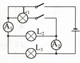22. (2025·江西宜春期中)如图所示,电灯$L_1、$$L_2、$$L_3$的连接方式是______,若将两个开关都闭合时$,A_1$和$A_2$的指针偏转角度相同,且电流表有两个量程分别为0~0.6A、0~3A,此时通过$L_1、$$L_3$的电流之比为1:8,当将控制$L_1$的开关断开发现$A_2$的示数减少了0.32A,那么两开关都闭合时,流过$L_2$的电流为______A.