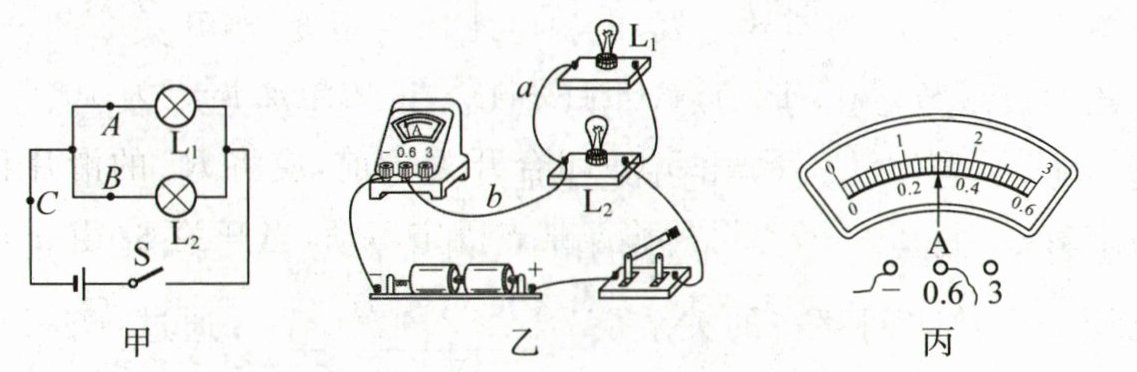(2) 小覃同学要测量通过$L_2$的电流,只需将图乙中导线______(选填"a"或"b")的一端移动到电流表的负接线柱上;重新连接好电路后,闭合开关,电流表的示数如图丙所示,则电流表的示数为______A.