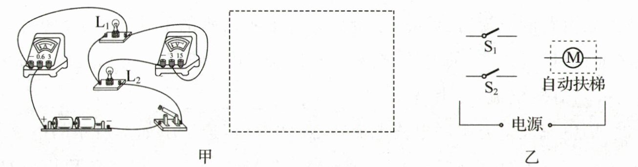 (2) 某景区的自动扶梯只需在白天且有人时才开启,请你设计一个电路,利用红外线自动开关$S_1($现场有人$S_1$闭合、现场无人$S_1$断开)以及可见光自动开关$S_2($白天$S_2$闭合、夜间$S_2$断开)控制电路.请在图乙中将自动扶梯实现上述功能的电路图补充完整.