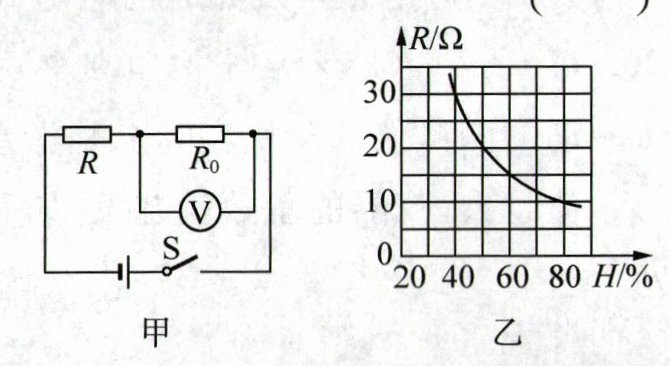 12. (2025·江苏宿迁月考)小伟给学校劳动实践基地的蔬菜大棚设计了一个测量空气湿度的电路图,如图甲所示.电源电压恒为 6 V,定值电阻 $ R_{0} $ 的阻值为 20Ω,湿敏电阻 R 的阻值随空气湿度 H 的变化关系如图乙所示.下列分析正确的是( )