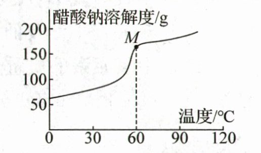 (3)$60\ ^\circ\text{C}$时醋酸钠的溶解度为$139.0\ \text{g}$,$239\ \text{g}\ \text{M}$点对应的溶液中含有$139.0\ \text{g}$醋酸钠和$100\ \text{g}$水,$239\ \text{g}\ \text{M}$点对应的溶液降温到$20\ ^\circ\text{C}$,$20\ ^\circ\text{C}$时醋酸钠的溶解度为$46.5\ \text{g}$,理论上最多析出$139.0\ \text{g}-46.5\ \text{g}=92.5\ \text{g}$醋酸钠。