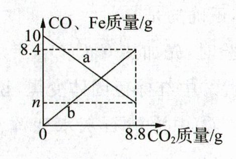 D 解析:一氧化碳与铁的氧化物在高温条件下反应生成铁和二氧化碳,随着反应的进行,二氧化碳的质量逐渐增大,一氧化碳的质量逐渐减小,铁的质量逐渐增大,则a表示一氧化碳的质量变化,b表示铁的质量变化,故A错误;当生成8.8g二氧化碳时,根据碳元素质量守恒,则参加反应的一氧化碳的质量为(8.8g×12/44×100%)÷(12/28×100%)=5.6g,则n=10g-5.6g=4.4g,故B错误;当生成8.8g二氧化碳时,生成铁的质量为8.4g,参加反应的一氧化碳的质量为5.6g,根据质量守恒定律,则参加反应的铁的氧化物的质量为8.8g+8.4g-5.6g=11.6g,根据铁元素质量守恒,则铁的氧化物中铁元素的质量为8.4g,氧元素的质量为11.6g-8.4g=3.2g,则FeₓOᵧ中x:y=8.4g/56:3.2g/16=3:4,故C错误;由C项分析可知,生成8.8g二氧化碳时,参加反应的铁的氧化物的质量为11.6g,则加入的铁的氧化物的质量m≥11.6,故D正确。