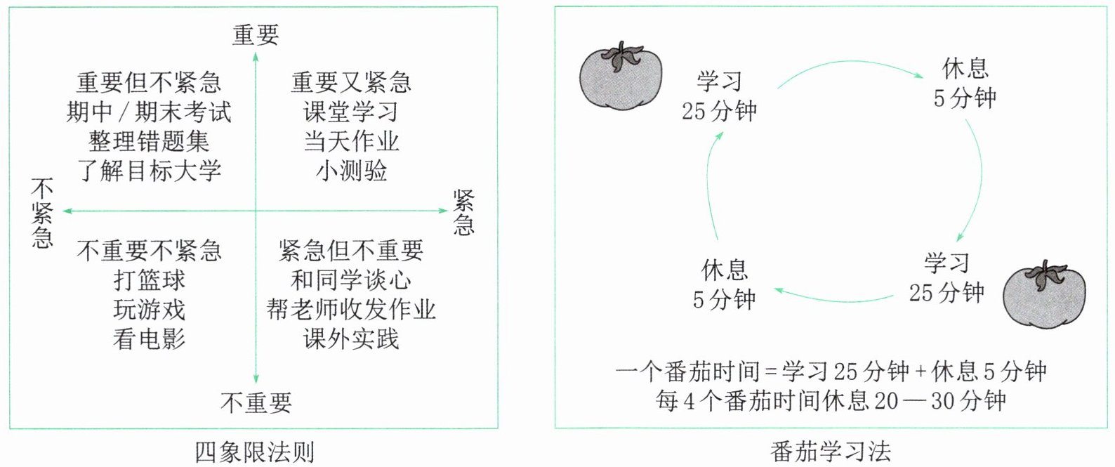 [材料三]① 中学生如何在学习过程中进行时间管理?可以试试"四象限法则"和"番茄学习法"。
