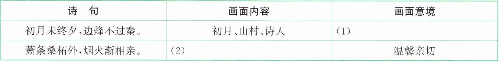 1. ★(新考法·情境化命题)手机短视频是当今很火爆的一种表现形式,小实同学想将这首诗后四句的意境,用手机短视频的形式表现出来,请你帮她完成下面的脚本。(2 分)