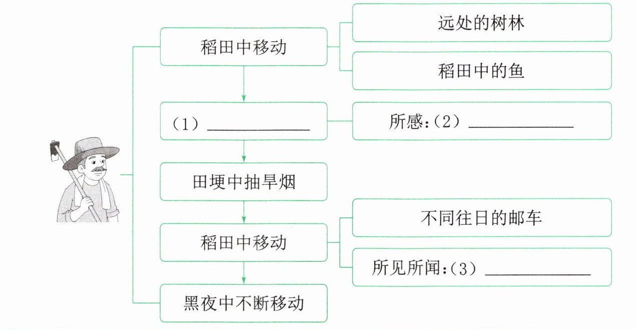 11.(1)在城市的经历(1分) (2)孤独、耻辱、煎熬(1分) (3)女儿跑来分享考上大学的喜讯(1分) (4)两处画线句都运用了比喻的修辞手法,(1分)甲句把农民比作一棵草,把他在城里遭受冷漠、蛮横对待时的煎熬状态写得形象生动,传达了作者的同情。(1分)乙句把在别旱烟袋的农民比作威武的将军,把他在稻田中的自在、拥有尊严感写得形象生动。(1分)从喻体的变化,可以看出农民从在城市的孤独、无措到在农村的自信、从容的转变。(1分)(5)虚实结合(1分)(6)这里运用了反复的修辞手法。(1分)形成一条线索,贯串农民劳作的过程;展现了农民劳作的辛劳与坚持;(2分)同时,一直“向前移动”的动作,也暗含着农民对其命运的坚守。(1分)
