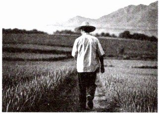 ⑥ 绿油油的稻田,无边的稻田,把他托起来,想让他飞,但他紧紧地抓住那些草,抓住一棵,松开,再去抓另一棵,永远也不离开这片土地,永远也不飞起来。天黑了,那个移动着的影子,还在移动。接着,我们看到了大地上空的星星。