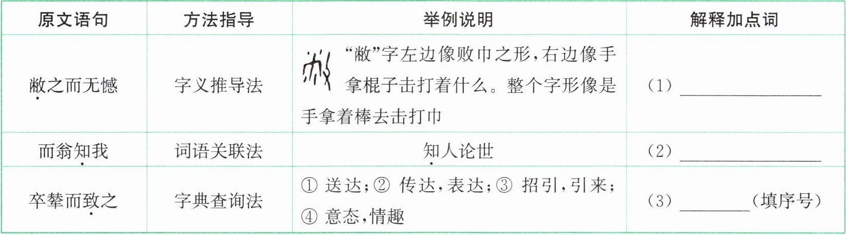 |卒辇而致之|字典查询法|① 送达;② 传达,表达;③ 招引,引来;④ 意态,情趣|(3)______(填序号)|