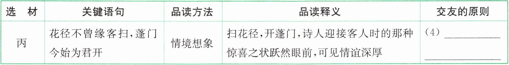 |丙|花径不曾缘客扫,蓬门今始为君开|情境想象|扫花径,开蓬门,诗人迎接客人时的那种惊喜之状跃然眼前,可见情谊深厚|(4)______|