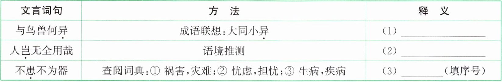 |不患不为器|查阅词典:① 祸害,灾难;② 忧虑,担忧;③ 生病,疾病|(3)______(填序号)|