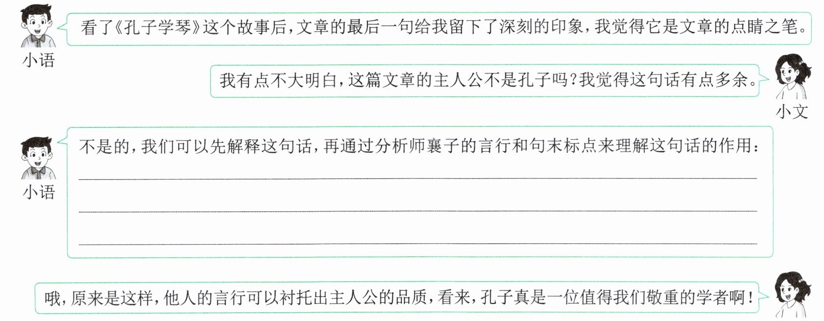4. 示例一:小智 《孔子学琴》的故事中,孔子边学习边思考,达到对曲子的深刻理解。我们一定要科学运用学习方法,这样才能取得进步! 示例二:小慧 孔子在学琴中一直在坚持,面对困难,孔子坚持钻研,没有放弃,最终深刻理解了曲子。相信自己,唯有坚守志向,才能重回巅峰。