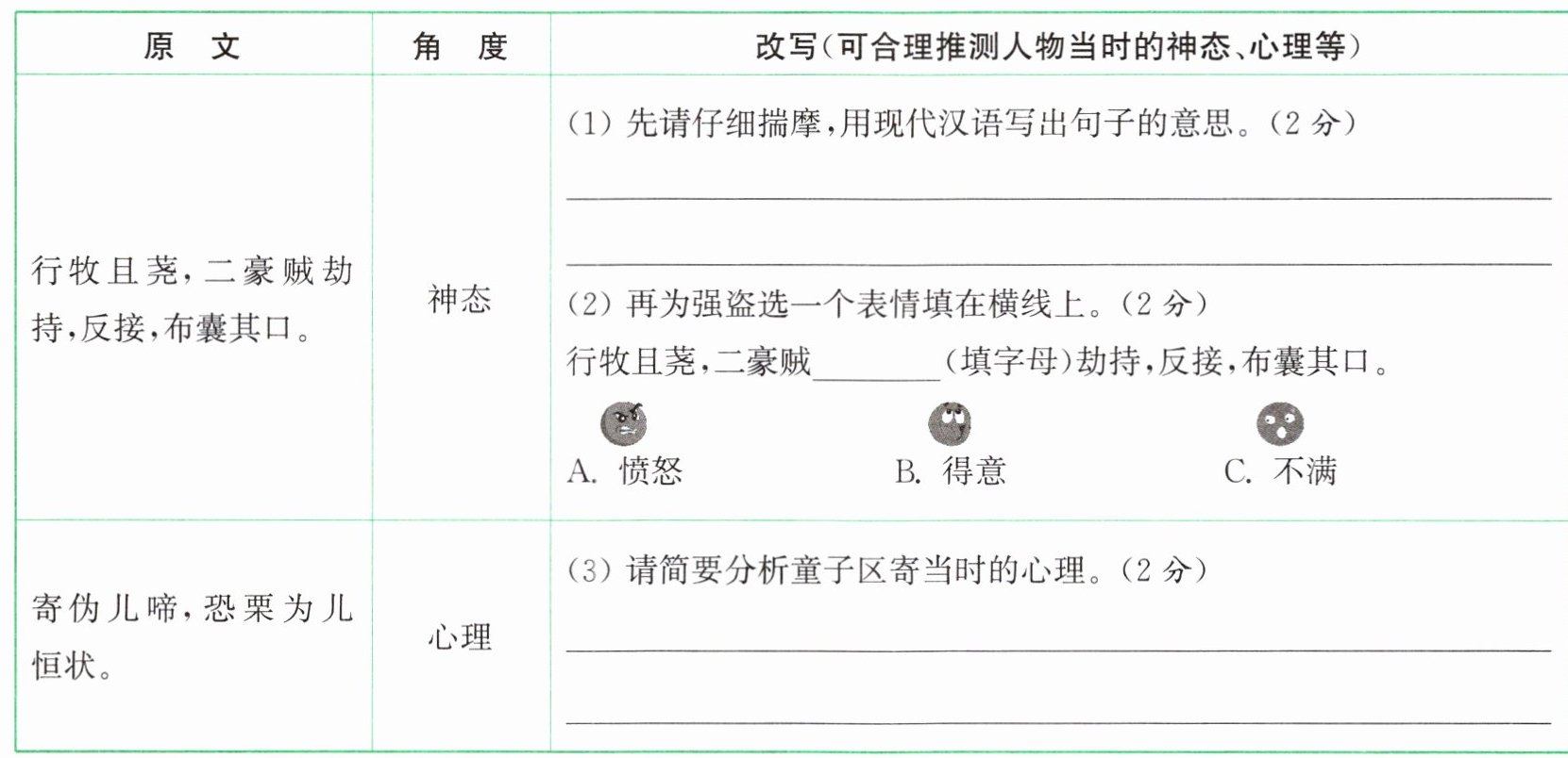 5.(1)(区寄)一边放牧一边打柴,两个凶悍的强盗绑架了他,把他反背着手捆起来,用布堵住他的嘴。(重点词语"且""囊"各 0.5 分,语句通顺 1 分) (2)B 解析:区寄是一个儿童,强盗成功绑架了区寄,并且反绑了他的双手,还用布堵住了他的嘴,以确保他不会反抗或求救。这种顺利的操作让他们感到自己计划得逞,因此显得得意扬扬,这个表情更能体现出强盗的猖狂和对区寄的轻视,为下文区寄机智逃脱做铺垫。故选 B。(2 分) (3)区寄假装像小孩一样啼哭,(假装)害怕得发抖,像小孩常有的状态那样,是为了让强盗放松警惕,以便寻找机会逃脱。(2 分)