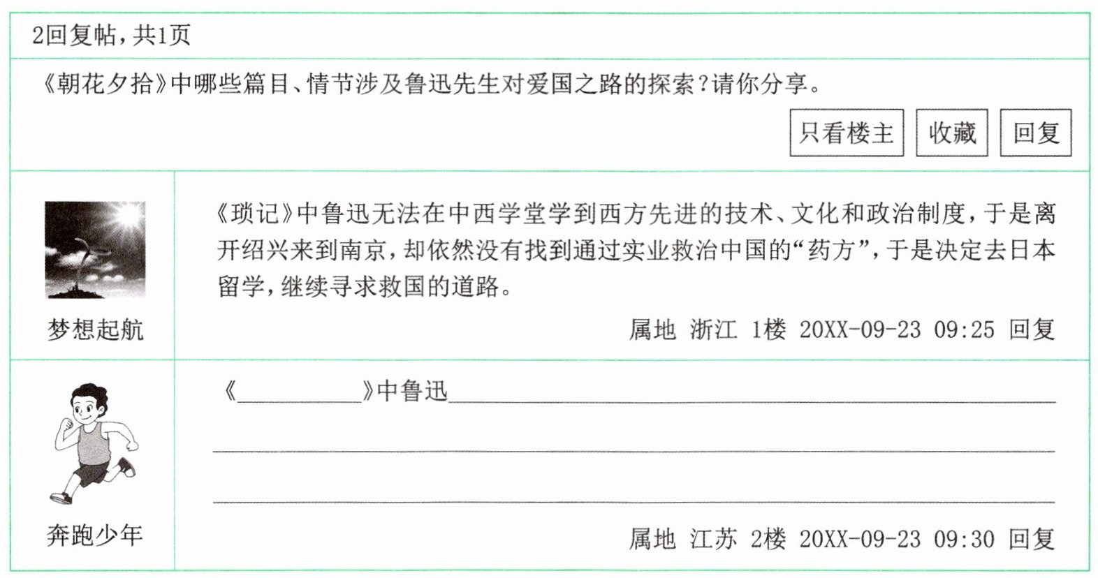 |奔跑少年|《______》中鲁迅__________________|属地 江苏 2楼 20XX-09-23 09:30 回复|