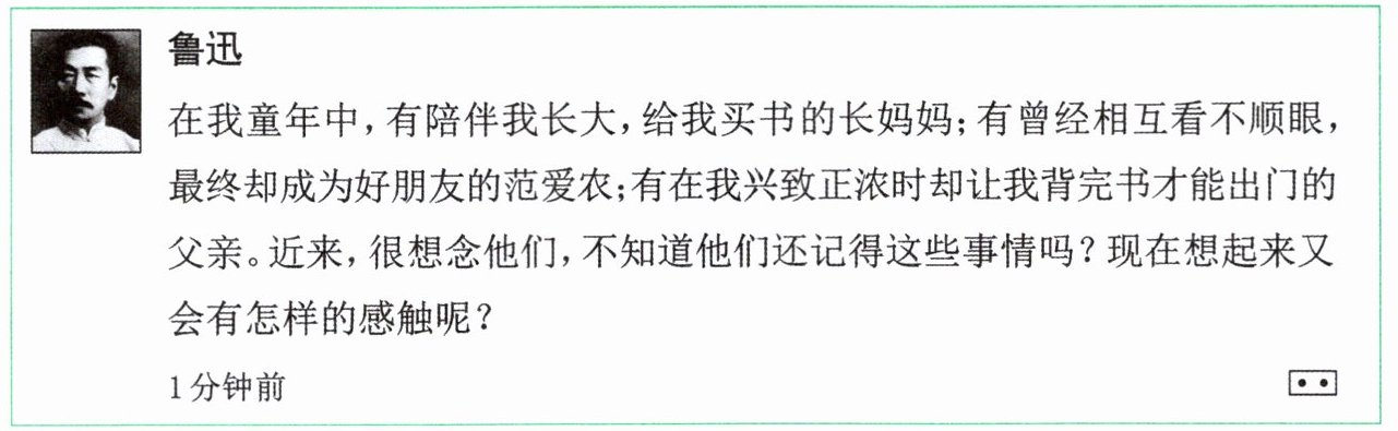 (2)(新考法·情境化命题)[任务二] 人的一生会遇到不同的人,他们会产生不同影响。下面是鲁迅发布的一条社交动态,请你仿照示例,以不同人物的口吻,根据发布的内容给鲁迅回复。(4 分)