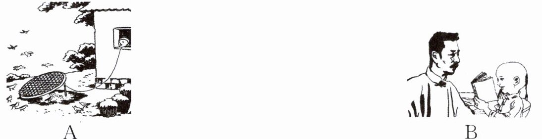 15. 示例一:插图A更适合。(2分)插图A以雪地捕鸟为整体画面。《从百草园到三味书屋》一文中较为详细地描写了童年鲁迅捕鸟的过程,表现了雪地捕鸟的乐趣,体现了全书中过往记忆的温馨。(4分) 示例二:插图B更适合。(2分)插图B以两个时期的鲁迅为整体画面。《朝花夕拾》是鲁迅成年后写的回忆性散文集,"过去的'我'"和"现在的'我'","小鲁迅"和"大鲁迅"不同的身份角色贯穿全书(或:写长妈妈、百草园等,展现了一位天真可爱的"小鲁迅";而指责封建孝道的残酷与虚伪和批判封建教育对儿童天性的压制,回顾旧日时光时夹杂着对社会的理性思考与批判,展现了一位深沉自省的"大鲁迅")。(4分)