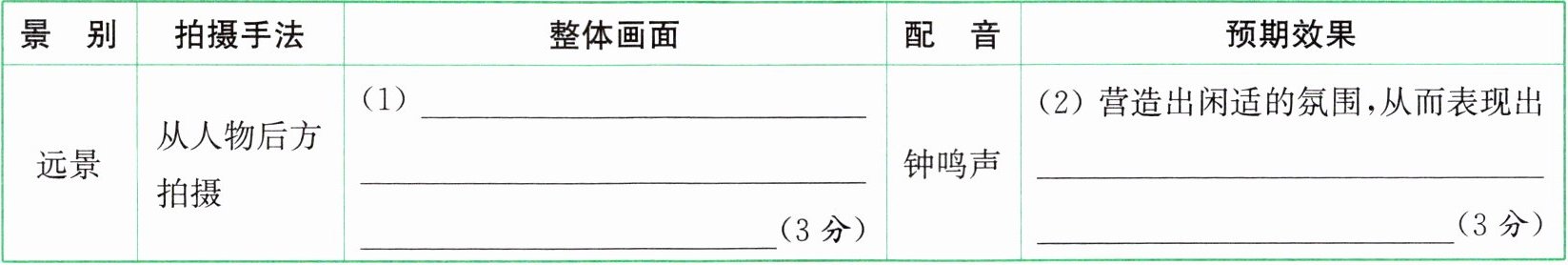 |远景|从人物后方拍摄|(1)__________________(3分)|钟鸣声|(2)营造出闲适的氛围,从而表现出____________(3分)|
