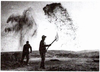 ⑤ 这时候,母亲拿着一种叫作木杈的工具开始拾麦秆。只见母亲把木杈反扣在麦秆上,轻轻地拾那些没有麦粒的麦秆子,母亲拾成堆,我和姐姐抱出麦场。天气很热,麦场上碾碎的麦秆子像浮尘一样到处都是,落在我们的头上和脖子里,我们满身的汗水和那些浮尘粘在一起,奇痒无比。