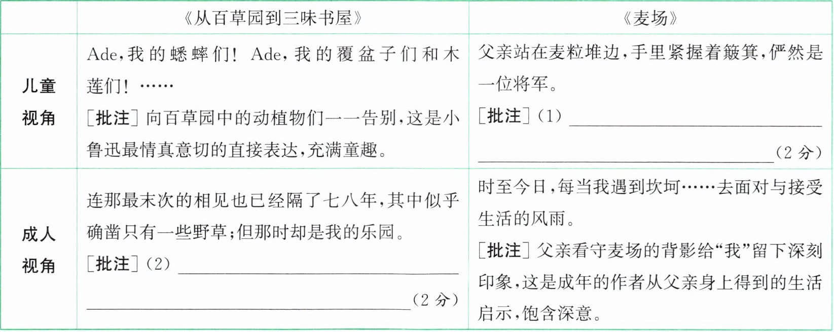 |儿童视角|Ade,我的蟋蟀们!Ade,我的覆盆子们和木莲们!……[批注] 向百草园中的动植物们一一告别,这是小鲁迅最情真意切的直接表达,充满童趣。|父亲站在麦粒堆边,手里紧握着簸箕,俨然是一位将军。[批注](1)______(2分)|