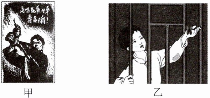 14. 示例一:选图甲。图甲是成岗戴脚镣手铐“高唱凯歌埋葬蒋家王朝”后英勇就义。(1分)成岗临危不惧、坚持真理、视死如归。(3分) 示例二:选图乙。图乙是小萝卜头在狱中放飞蝴蝶。(1分)小萝卜头活泼懂事、坚强勇敢、渴望自由。(3分)