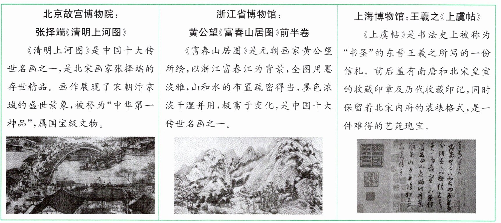 |北京故宫博物院:张择端《清明上河图》《清明上河图》是中国十大传世名画之一,是北宋画家张择端的存世精品。画作展现了宋朝汴京的盛世景象,被誉为“中华第一神品”,属国宝级文物。|浙江省博物馆:黄公望《富春山居图》前半卷《富春山居图》是元朝画家黄公望所绘,以浙江富春江为背景,全图用墨淡雅,山和水的布置疏密得当,墨色浓淡干湿并用,极富于变化,是中国十大传世名画之一。|上海博物馆:王羲之《上虞帖》《上虞帖》是书法史上被称为“书圣”的东晋王羲之所写的一份信札。前后盖有南唐和北宋皇室的收藏印章及历代收藏印记,同时保留着北宋内府的装潢格式,是一件难得的艺苑瑰宝。|
