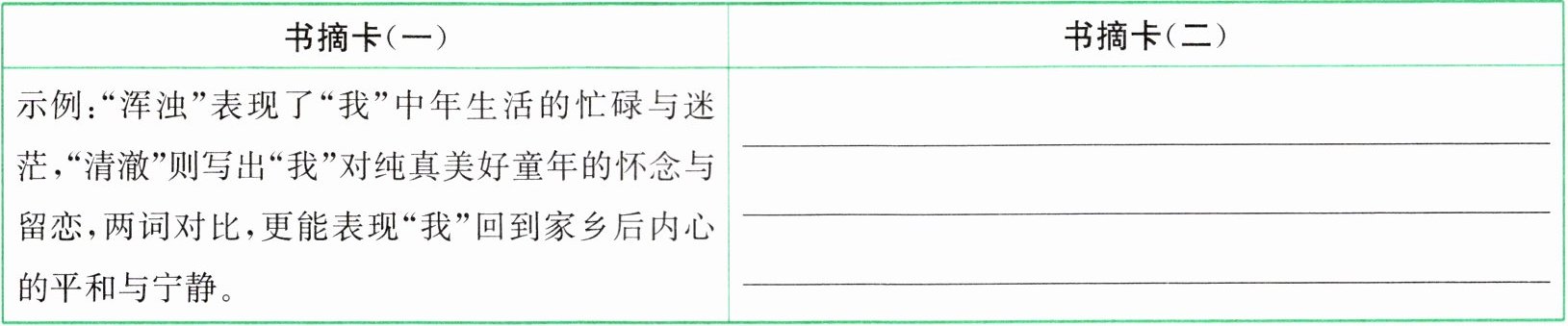 |示例:“浑浊”表现了“我”中年生活的忙碌与迷茫,“清澈”则写出“我”对纯真美好童年的怀念与留恋,两词对比,更能表现“我”回到家乡后内心的平和与宁静。|______|