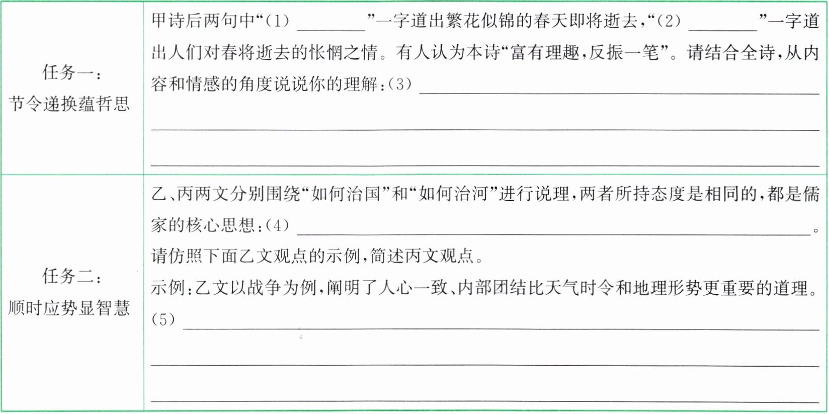 |任务二:顺时应势显智慧|乙、丙两文分别围绕"如何治国"和"如何治河"进行说理,两者所持态度是相同的,都是儒家的核心思想:(4)______。请仿照下面乙文观点的示例,简述丙文观点。示例:乙文以战争为例,阐明了人心一致、内部团结比天气时令和地理形势更重要的道理。(5)______|