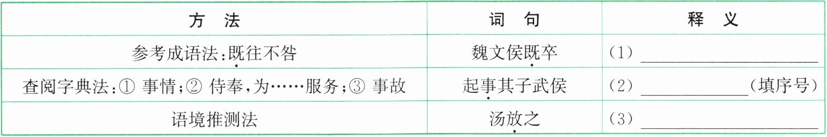 |查阅字典法:① 事情;② 侍奉,为……服务;③ 事故|起事其子武侯|(2) ______(填序号)|