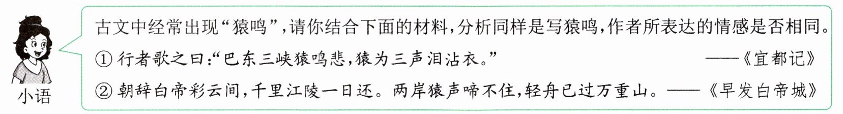 古文中经常出现"猿鸣",请你结合下面的材料,分析同样是写猿鸣,作者所表达的情感是否相同。