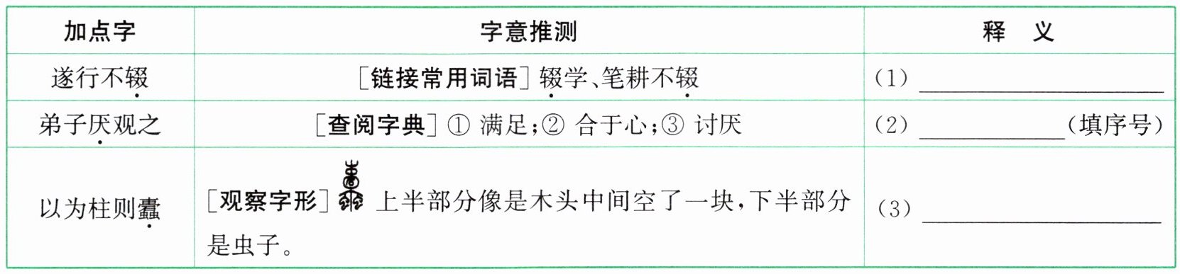 | 弟子厌观之 | [查阅字典]① 满足;② 合于心;③ 讨厌 | (2)______(填序号) |