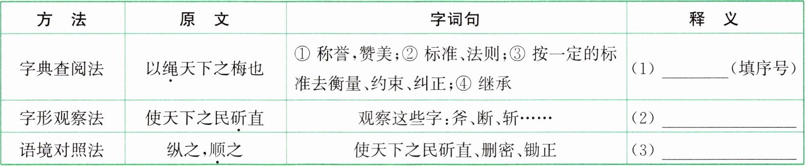 | 字典查阅法 | 以绳天下之梅也 | ① 称誉,赞美;② 标准、法则;③ 按一定的标准去衡量、约束、纠正;④ 继承 | (1)______(填序号) |