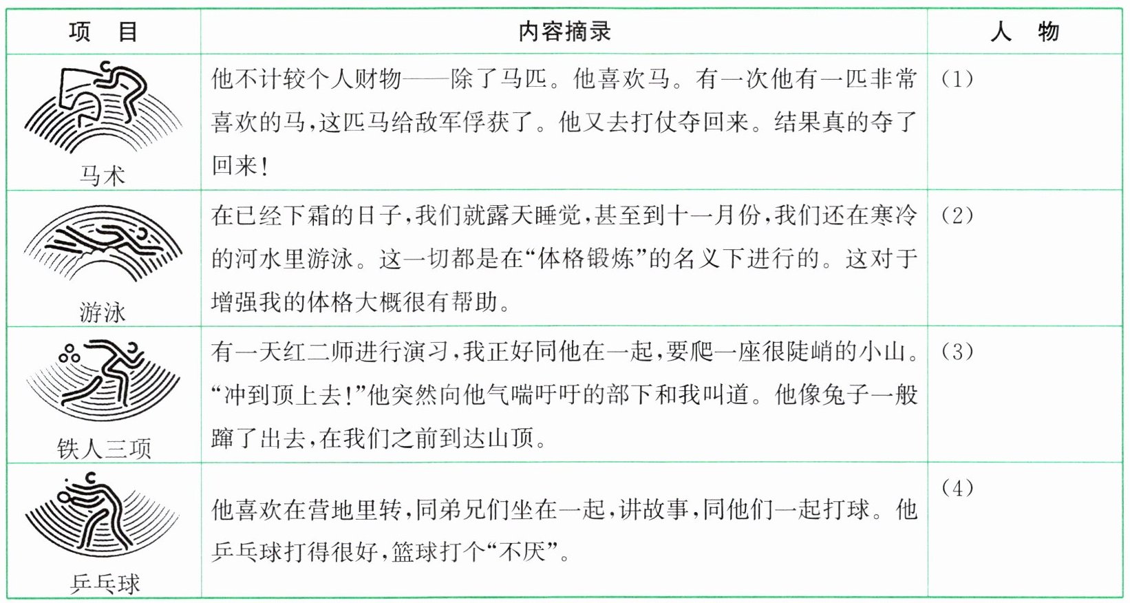 |乒乓球|他喜欢在营地里转,同弟兄们坐在一起,讲故事,同他们一起打球。他乒乓球打得很好,篮球打个"不厌"。|(4)______|