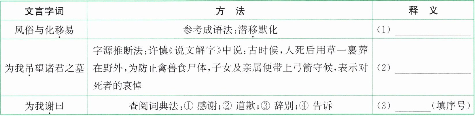 | 为我谢曰 | 查阅词典法:① 感谢;② 道歉;③ 辞别;④ 告诉 | (3)______(填序号) |
