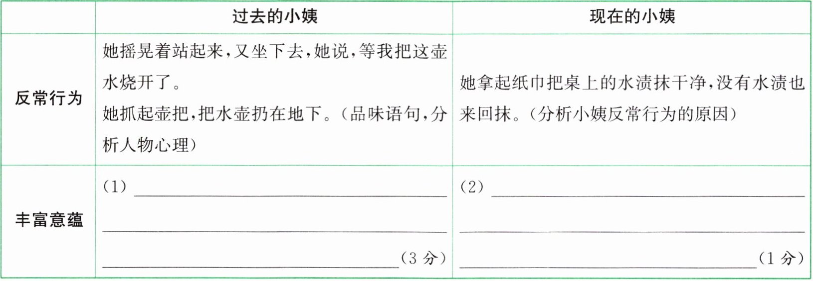 |反常行为|她摇晃着站起来,又坐下去,她说,等我把这壶水烧开了。她抓起壶把,把水壶扔在地下。(品味语句,分析人物心理)|她拿起纸巾把桌上的水渍抹干净,没有水渍也来回抹。(分析小姨反常行为的原因)|