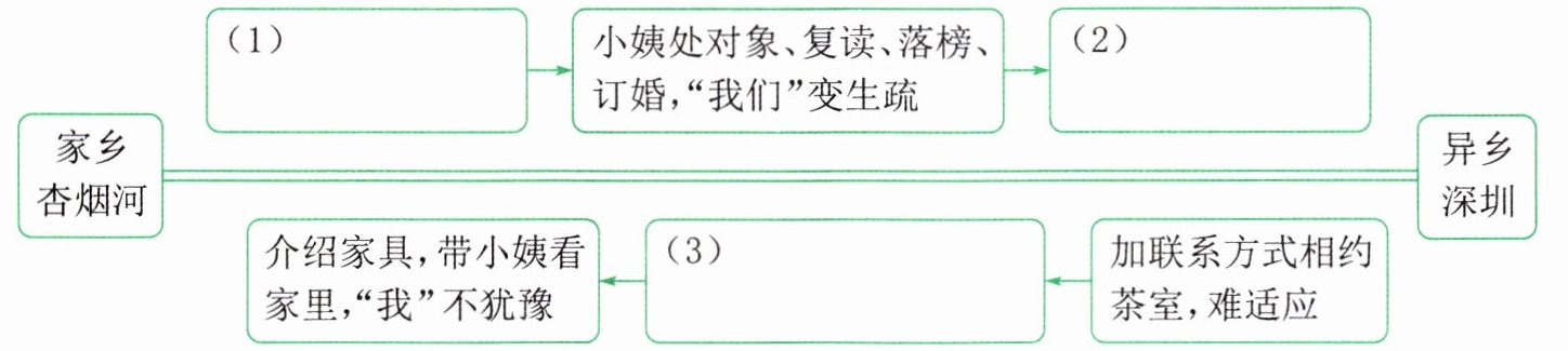 家乡杏烟河 —— (1)______ —— 小姨处对象、复读、落榜、订婚,“我们”变生疏 —— (2)______ —— 异乡深圳