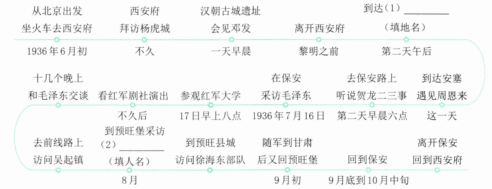 14. [把握事实]阅读纪实作品,要清楚地把握作品所写的事实。小语同学整理了 1936 年 6 月至 10 月斯诺采访“红色中国”的主要行程,请补全横线处的内容。(2 分)