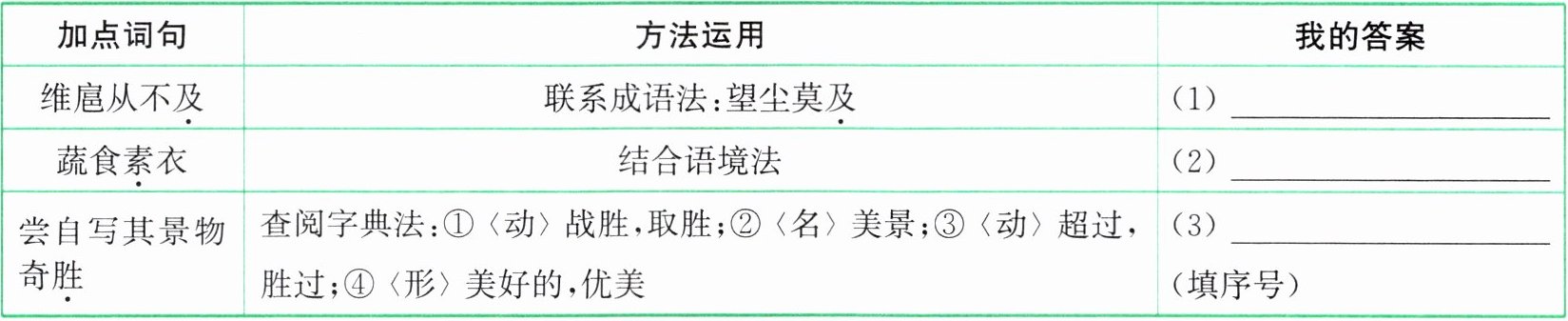 | 蔬食素衣 | 结合语境法 | (2)______ |
