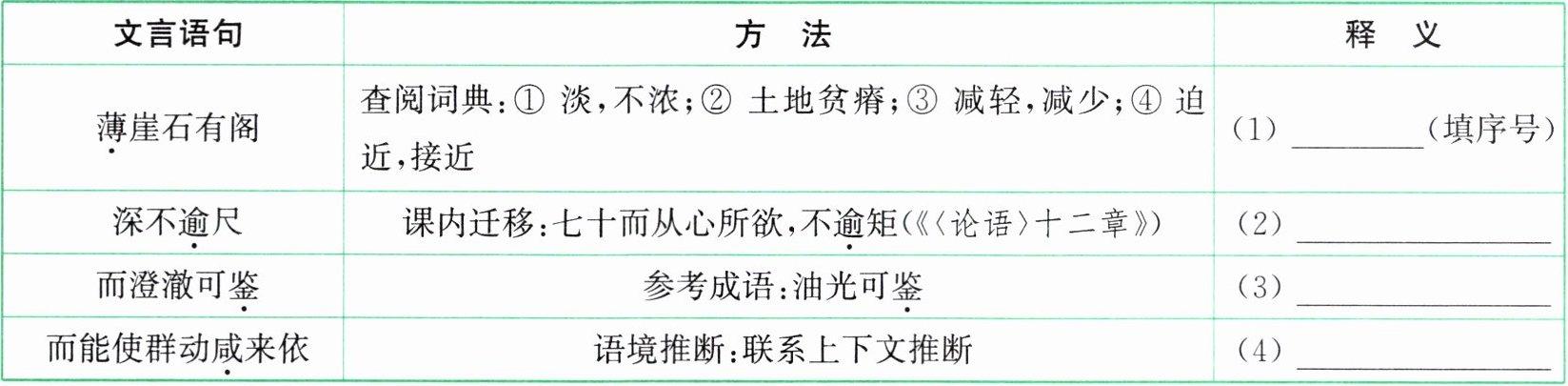 |深不逾尺|课内迁移:七十而从心所欲,不逾矩(《〈论语〉十二章》)|(2)______|