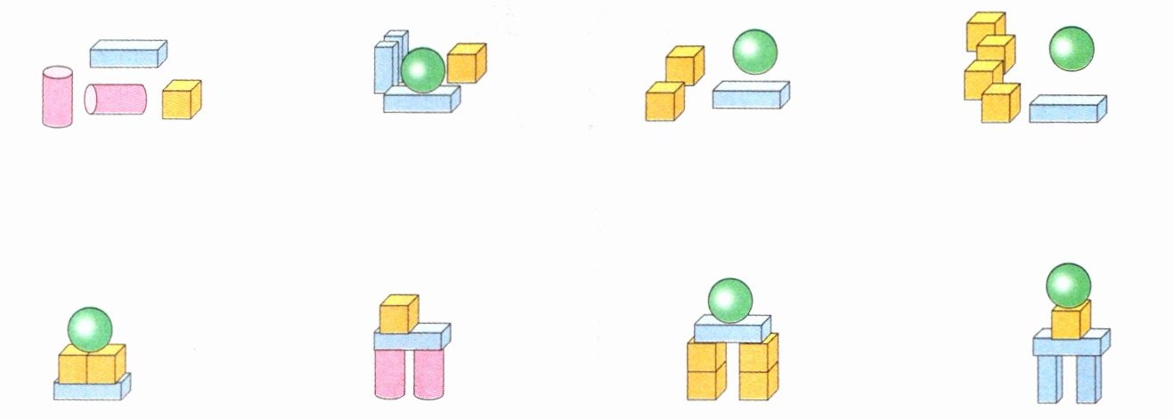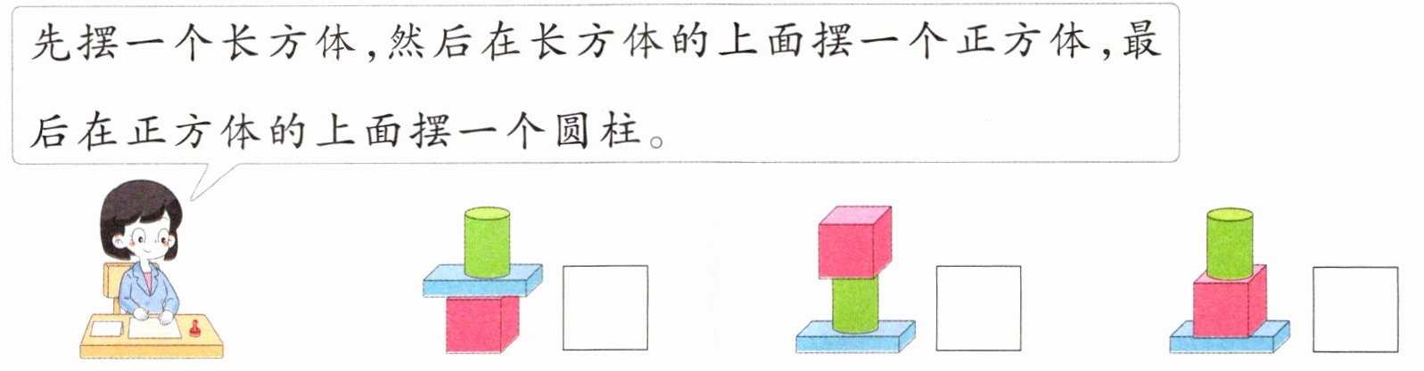先摆一个长方体,然后在长方体的上面摆一个正方体,最后在正方体的上面摆一个圆柱。